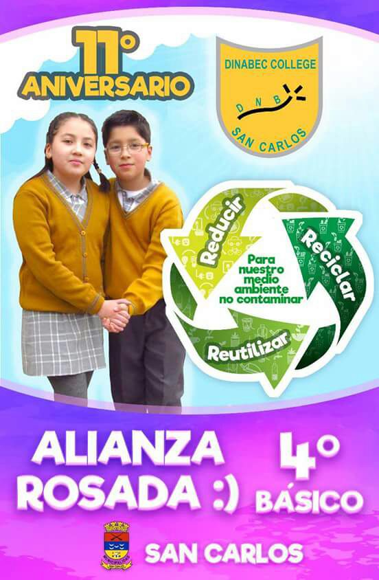Por su parte, los representantes de la Alianza Rosada son Valentina Rosales y Sebastián Piceros, del cuarto Año básico. Slogan: «Para nuestro medio ambiente no contaminar: reciclar, reutilizar, reducir».
