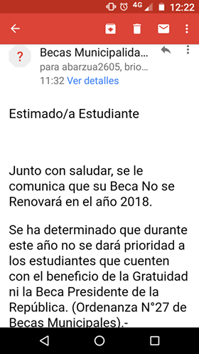En tanto, esta mañana algunos han recibido el siguiente correo electrónico: »Estimado/a Estudiante: Junto con saludar, se le comunica que su Beca No se Renovará en el año 2018. Se ha determinado que durante este año no se dará prioridad a los estudiantes que cuenten con el beneficio de la Gratuidad ni la Beca Presidente de la República. (Ordenanza N°27 de Becas Municipales). Sin otro particular y esperando contar con vuestra comprensión, se despide atte., Pd. Si hay un error y no cuenta con Gratuidad, acercarse a DIDECO 1° Piso I. Municipalidad de San Carlos. Encargada de Becas I.Municipalidad de San Carlos».