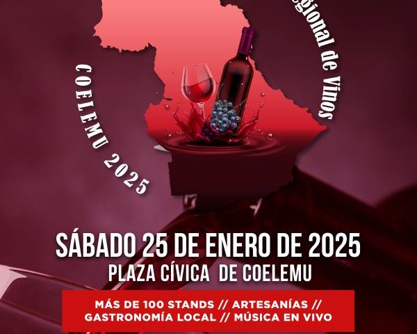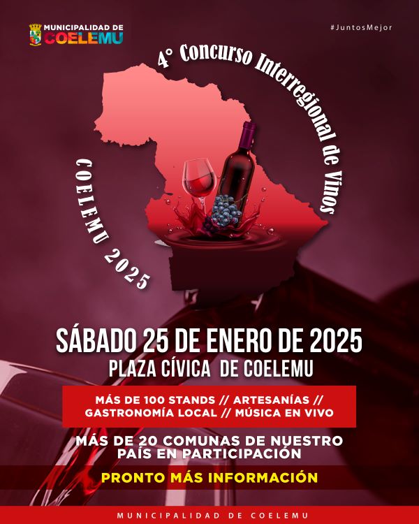 La Municipalidad de Coelemu se complace en invitar a la comunidad a participar en el 4° Concurso Interregional de Vinos – Coelemu 2025, que se llevará a cabo el sábado 25 de enero, desde las 10:00 horas, en la Plaza Cívica de la comuna.