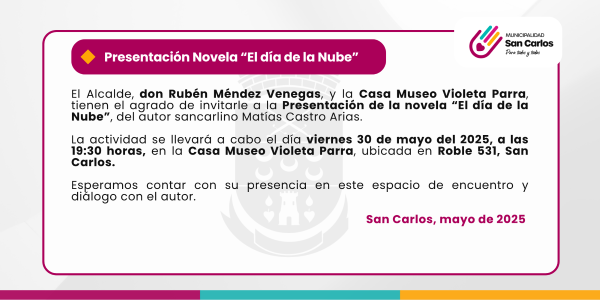 La Casa Museo Violeta Parra, tiene el agrado de invitarle a la presentación de la novela «El Día de la Nube», del autor sancarlino Matías Castro Arias, la que se llevará a cabo el día viernes 30 del presente, a las 19:30 Hrs.