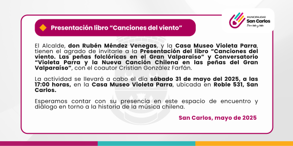 La Casa Museo Violeta Parra, tiene el agrado de invitarle a la presentación del libro «Canciones del Viento. Las peñas folclóricas en el gran Valparaíso» y conversatorio «Violeta Parra y las nueva canción chilena en las peñas del gran Valparaíso», con el Coautor Critian Gonzlez Farfan, la que se llevará a cabo el día sábado 31 del presente, a las 17:00Hrs.